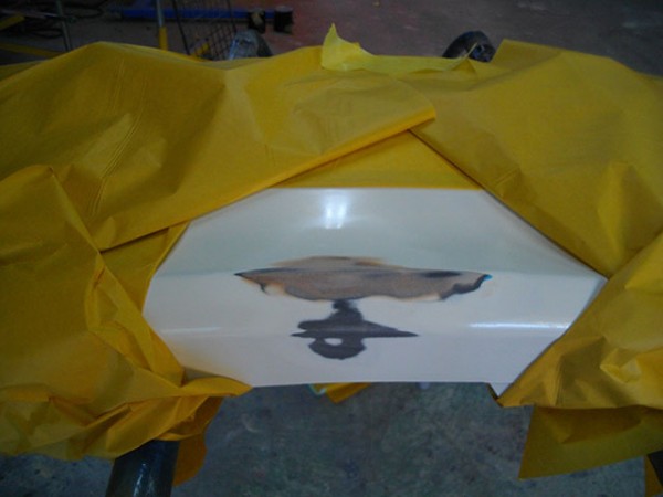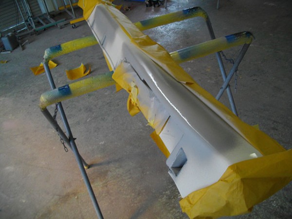 修理箇所の塗装を剥がし若干のヘコミ部分にパテを盛りサフェイサーを塗布しました。