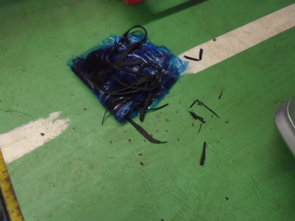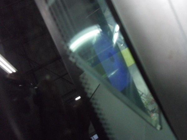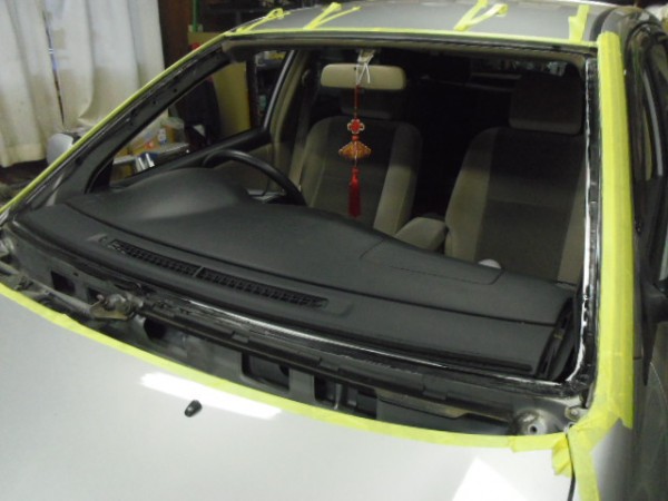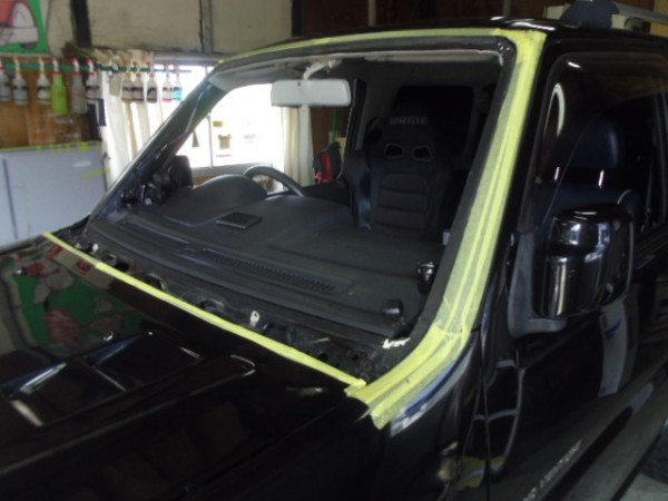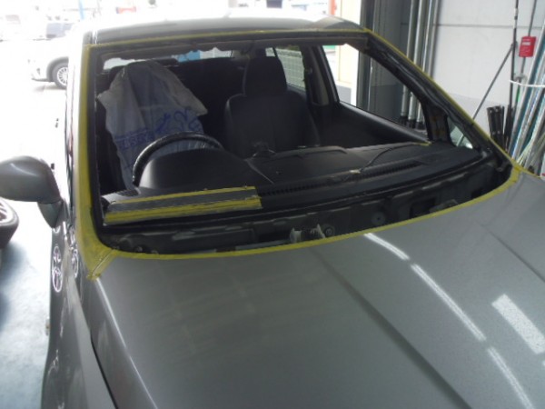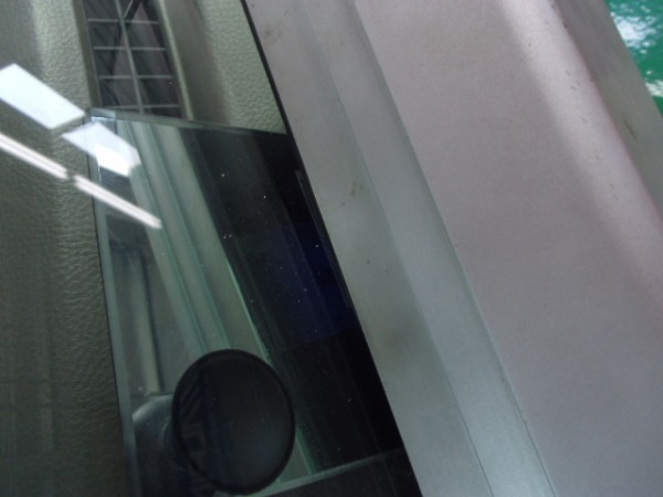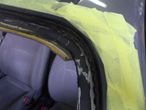 割れたガラスを外し、ボディー側に残ってるシーラント(ガラス接着剤)を削いで平らにします