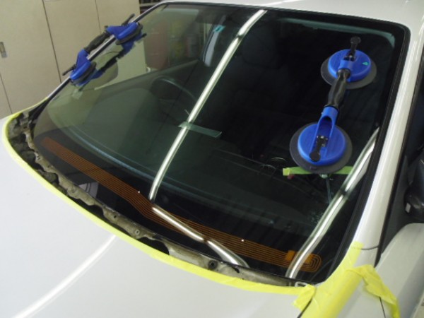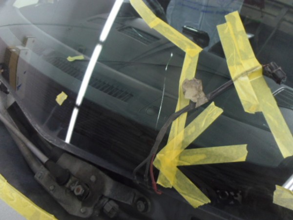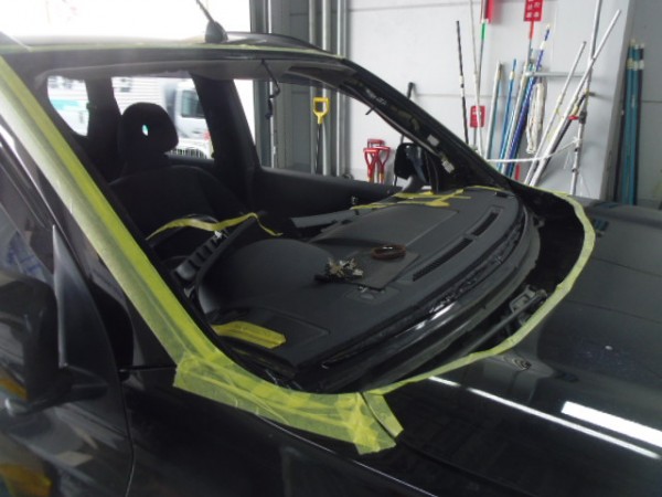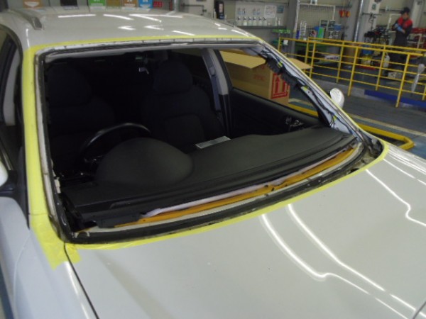 ワイパー類を外し、デアイサーのコネクターを外してからガラスを外します