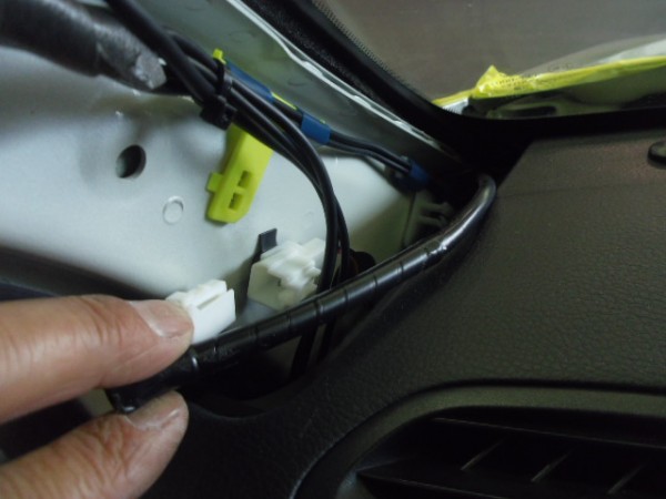 助手席側のピラーを外すとデアイサーのコネクターがあり、ここを外します