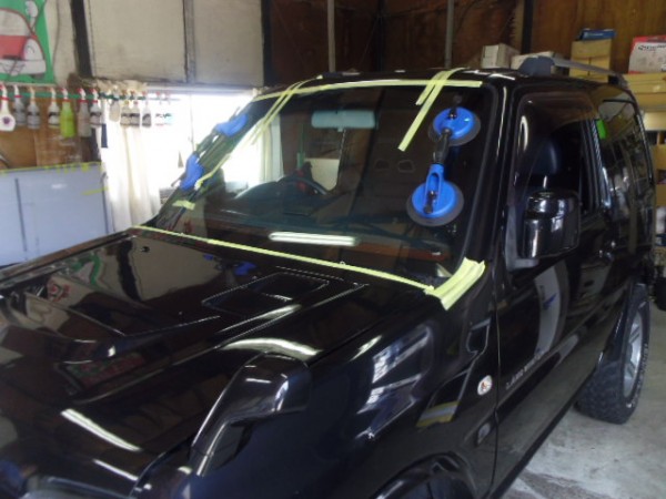 フィルムを貼ったブルーボカシ付き&デアイサー(ワイパー熱線)付きタイプの社外ガラスも準備OK