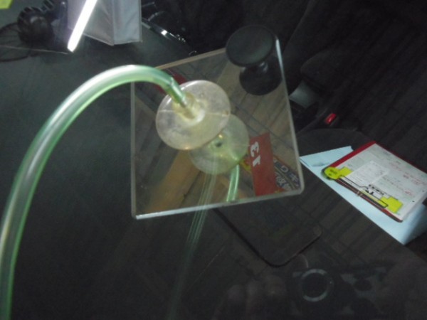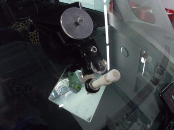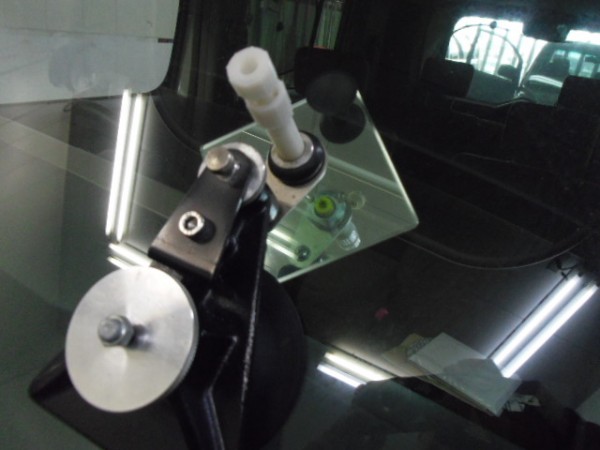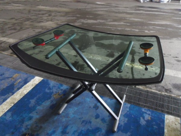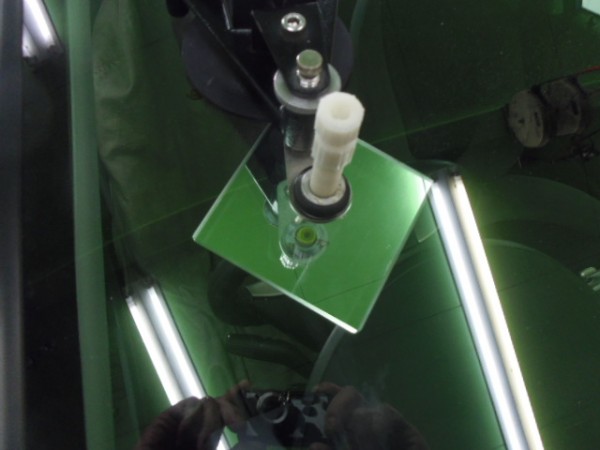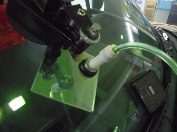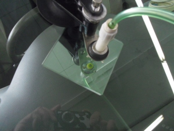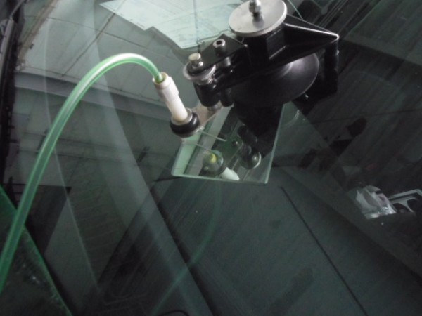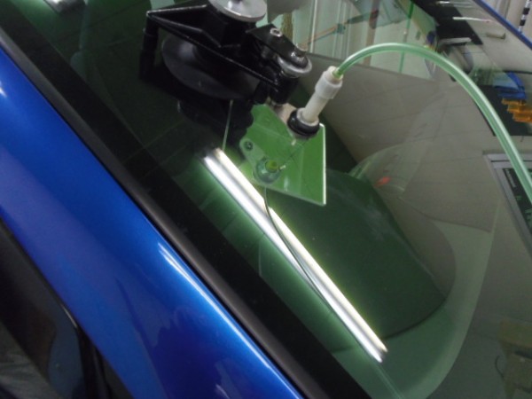 ガラスの取り付けに使う接着剤は非常に乾燥が速いため素早く位置を合わせて取り付けします
