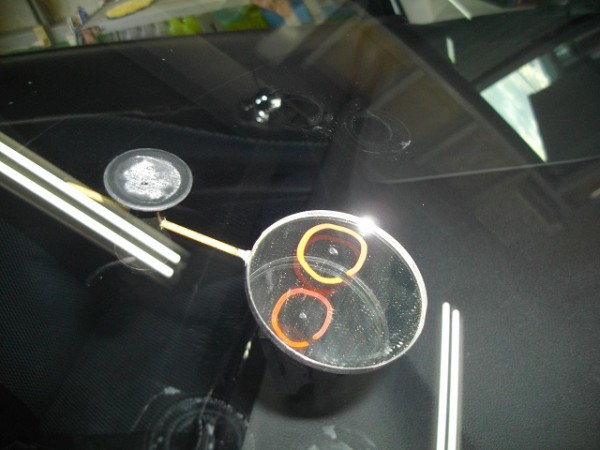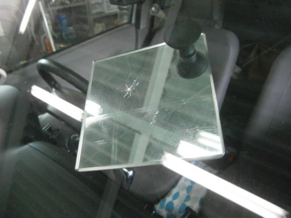 運転席側、端から10センチ位の位置にブルズアイ状のヒビ