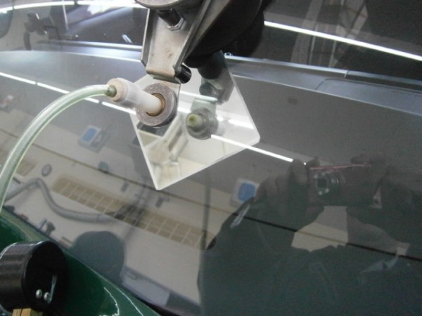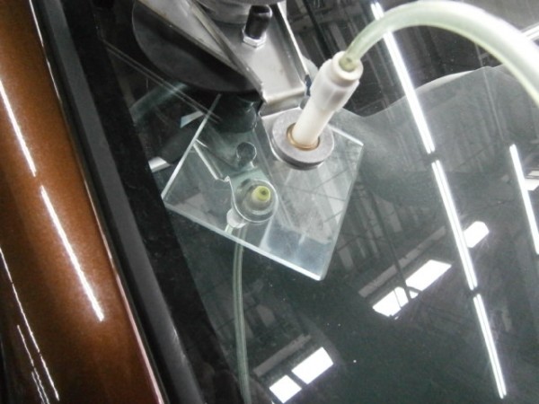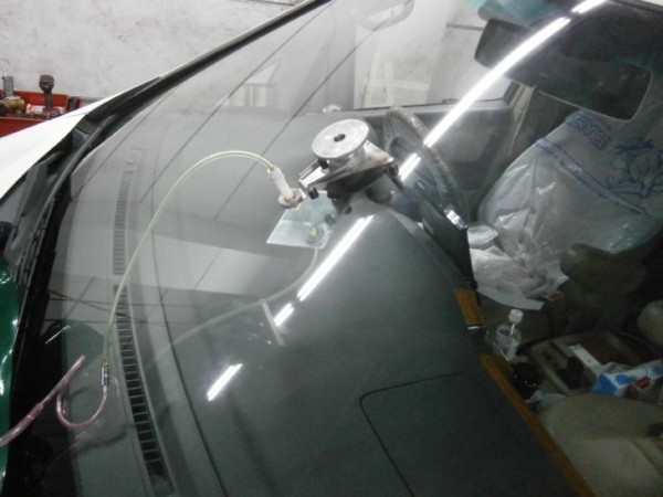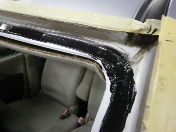 ガラス側にもプライマーを塗って準備、ガラス接着剤を打って車体へ取り付けます