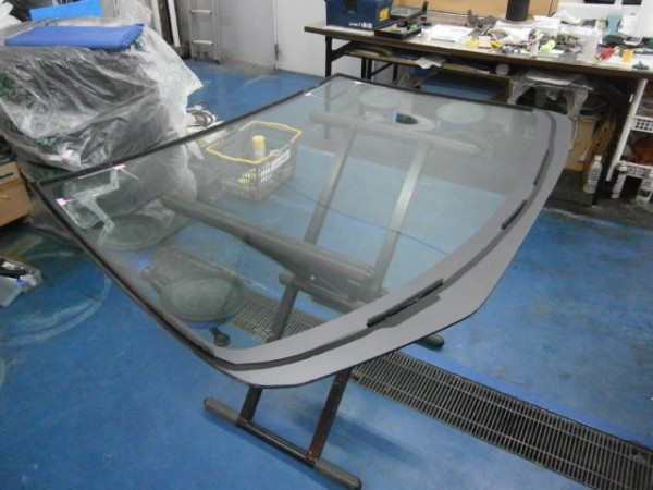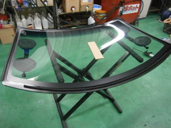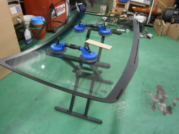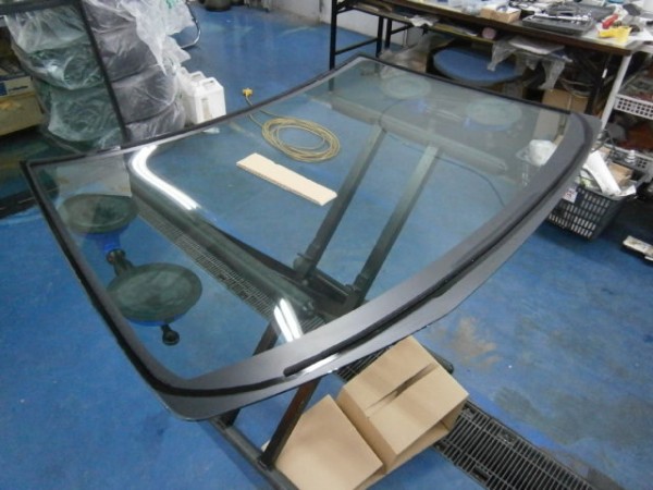 新品ガラスの用意、先付けモール、TVアンテナ等を付けてからガラス専用接着剤を打っててから車体に乗せます