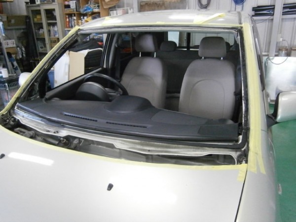 ガラスを外し、残ったシーラント(ガラス糊)を削ぎ落してプライマー処理