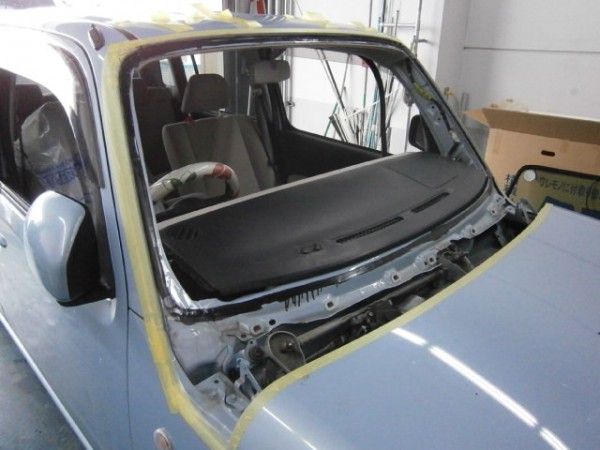 割れたガラスを外してスクレーパーで少し削れてしまった所にプライマーを塗ります