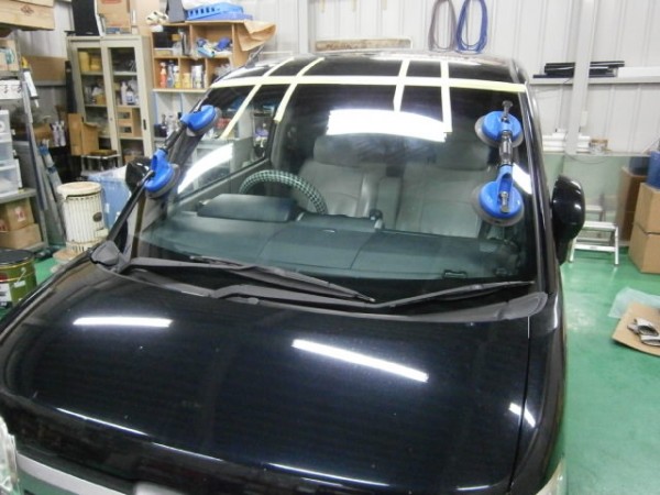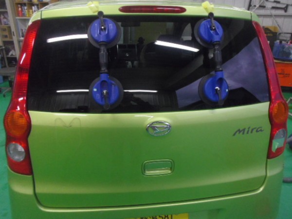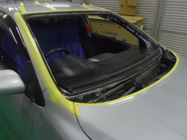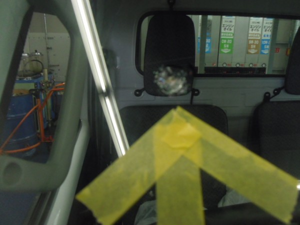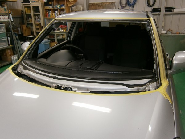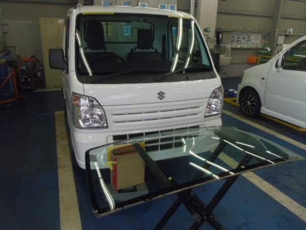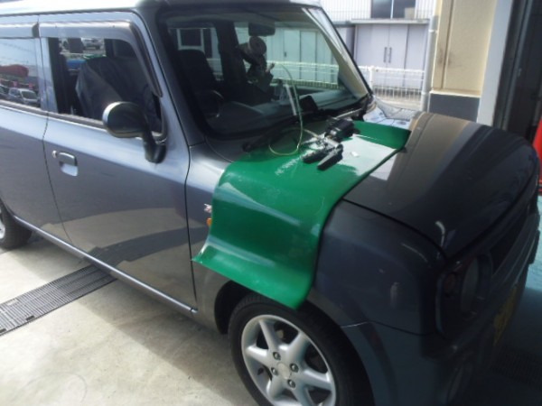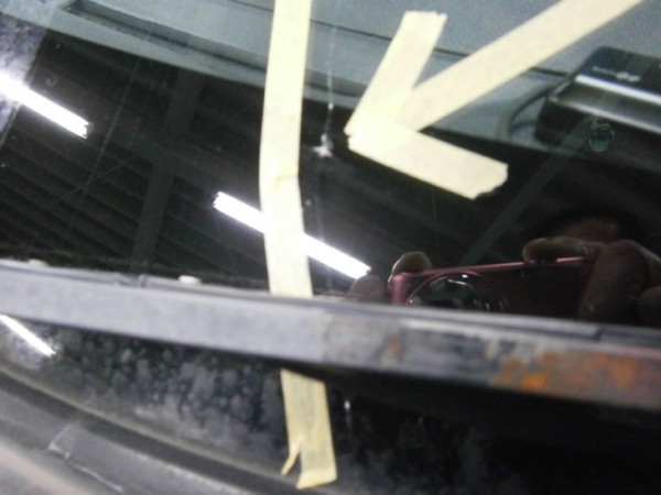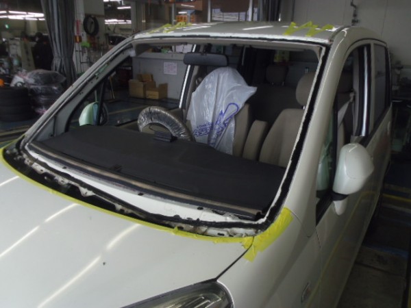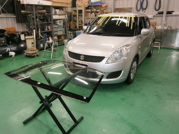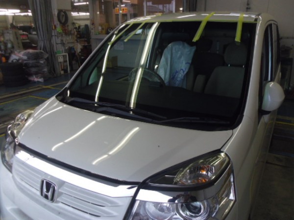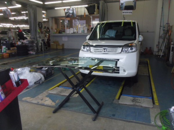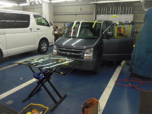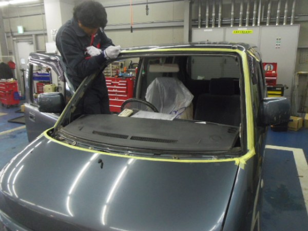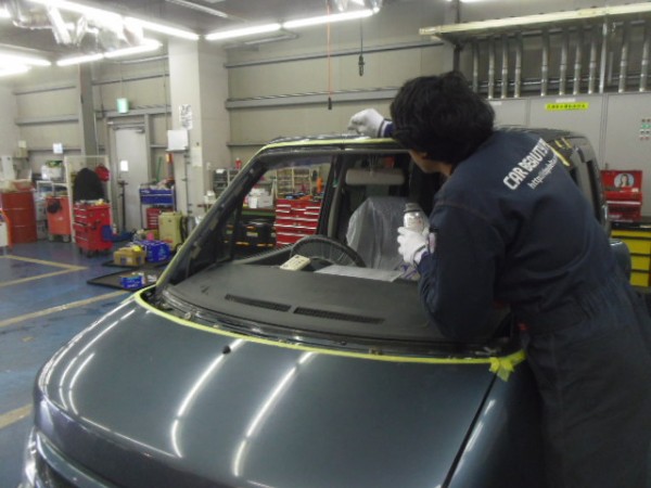車検でご入庫のラパンに飛び石によるヒビ割れがあり、修理にかかります