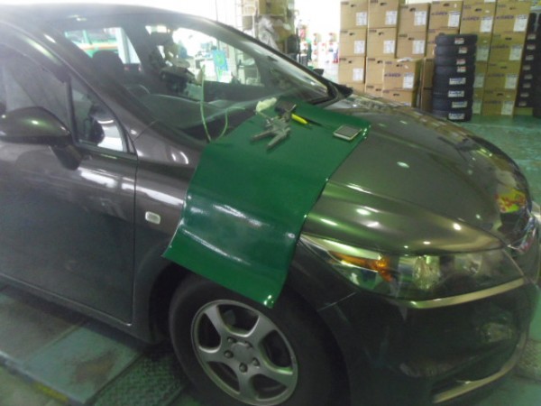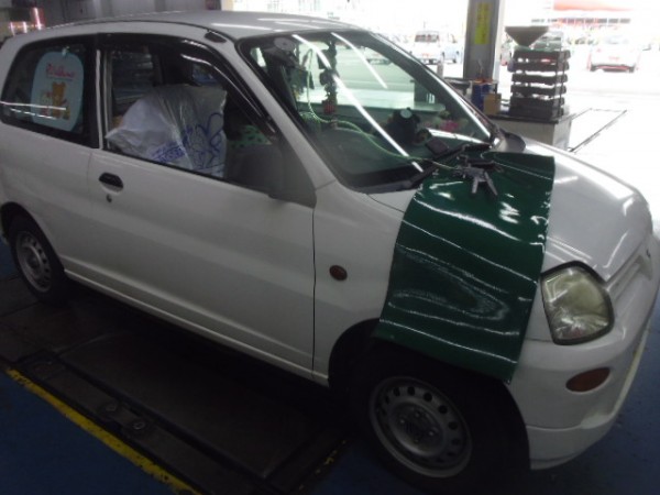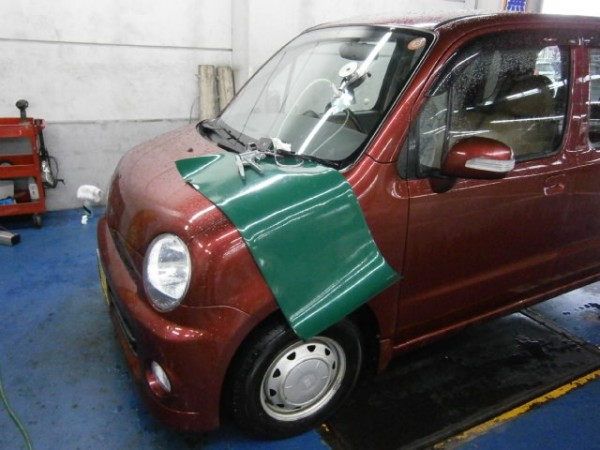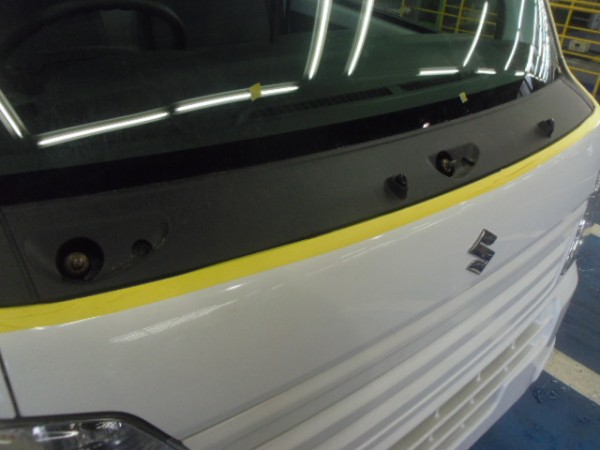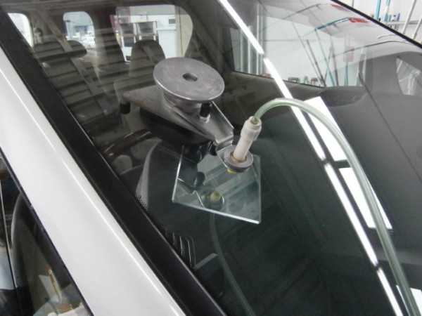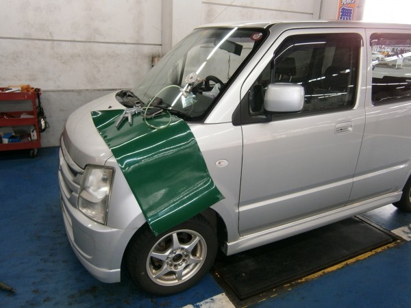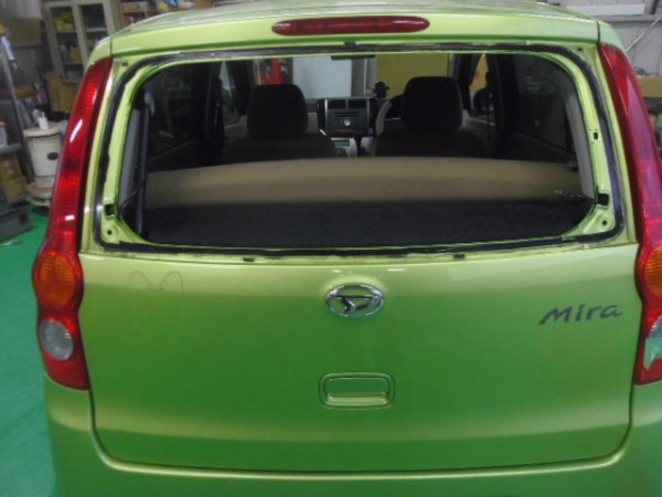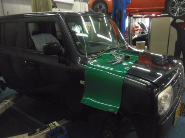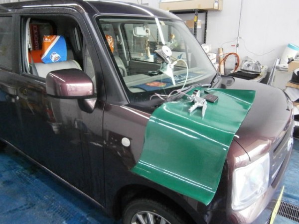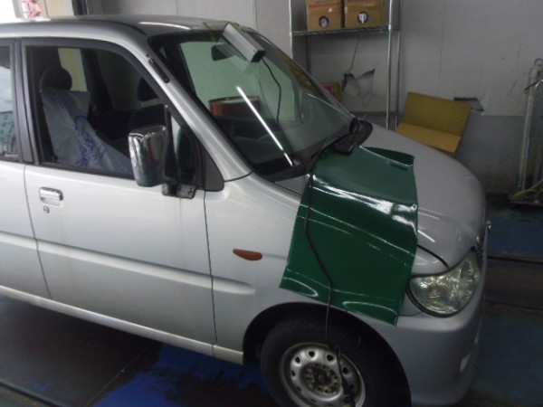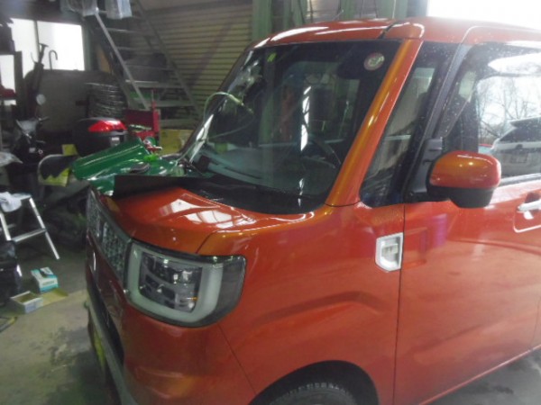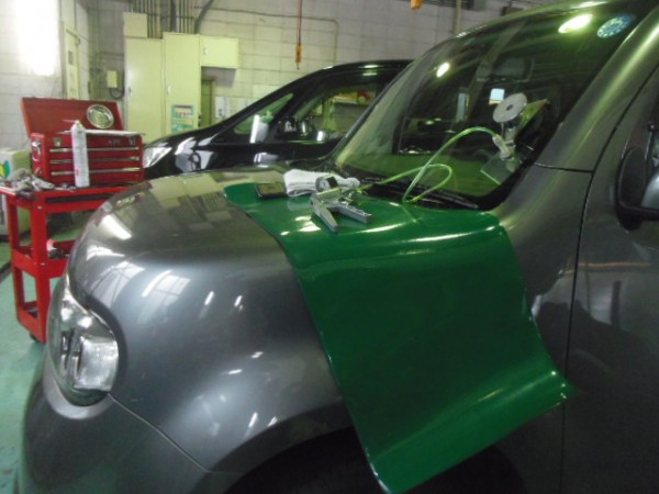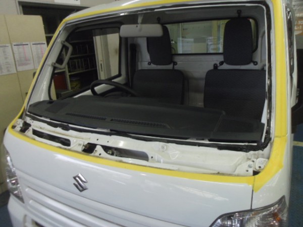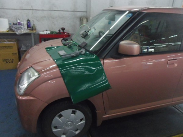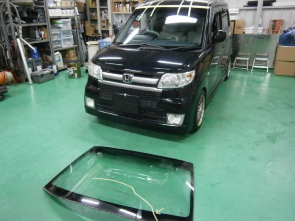 車検でご入庫のラパンに飛び石によるヒビ割れがあり、修理にかかります