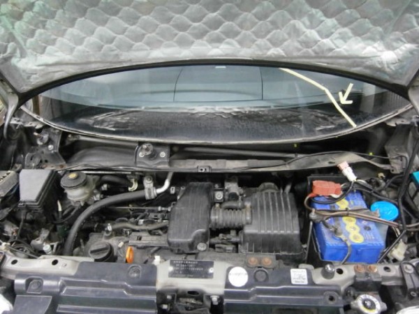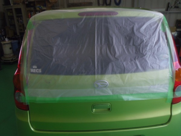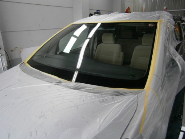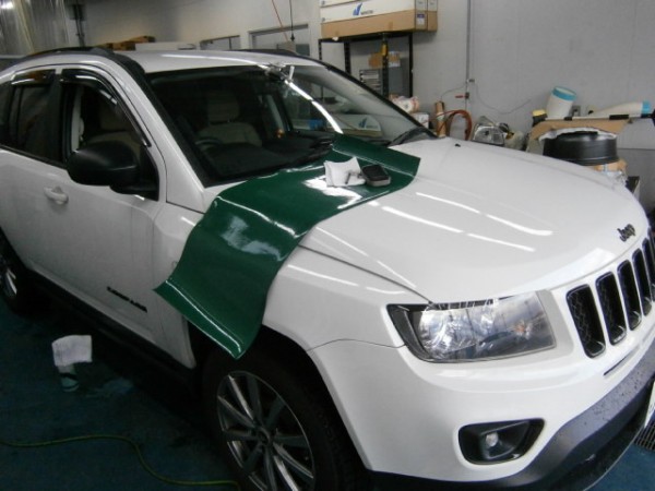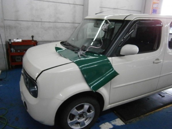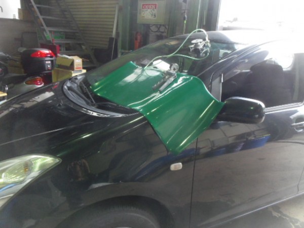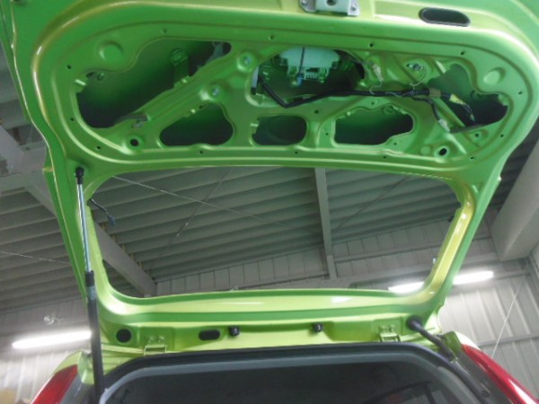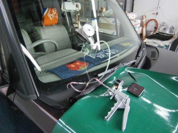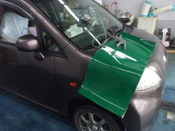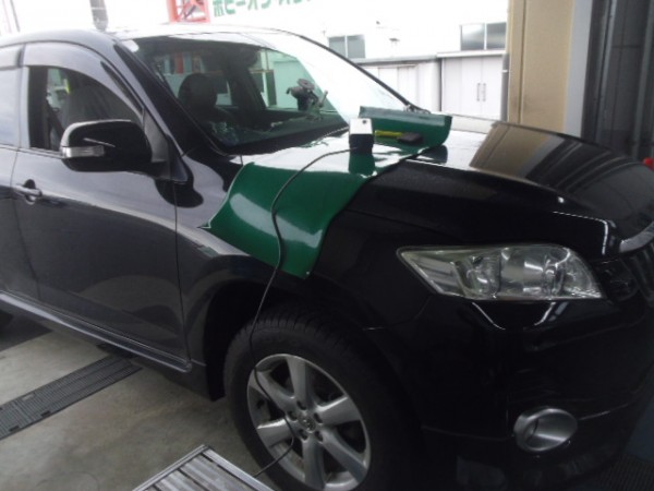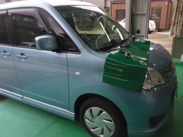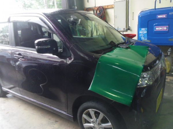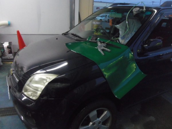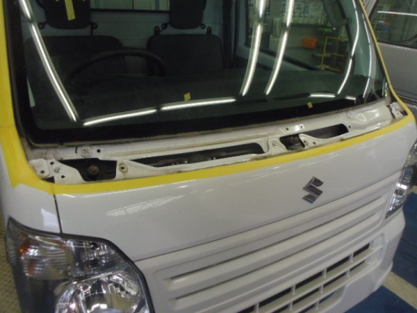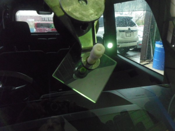 車検でご入庫のラパンに飛び石によるヒビ割れがあり、修理にかかります