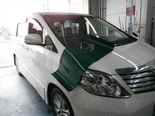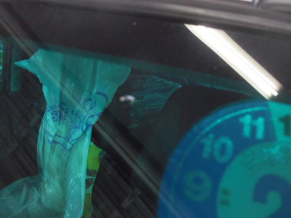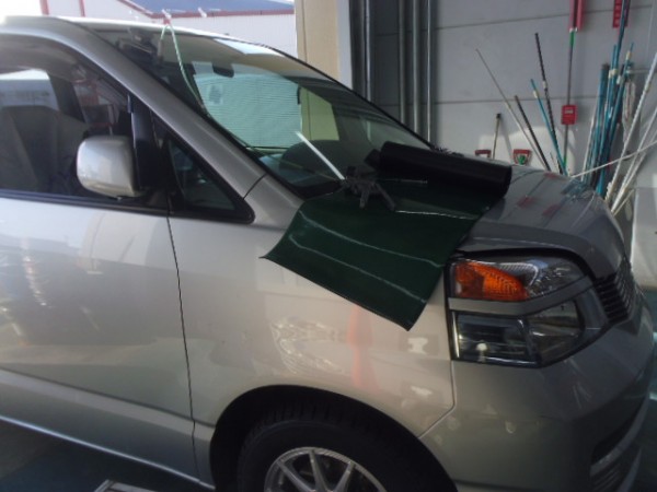 朝1番に飛び石によるヒビ割れ修理です