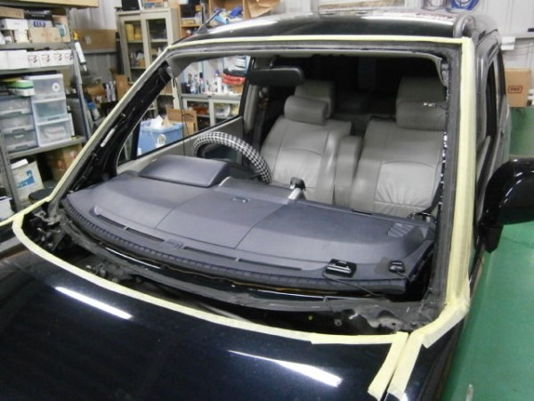 モールも外してガラスもシーラント(ガラス接着剤)を切り取ります