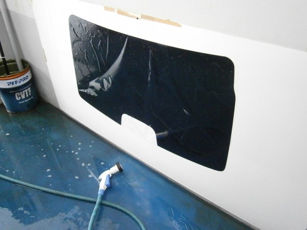 スライドドアの次はクォーターガラスのフィルムを貼ります。