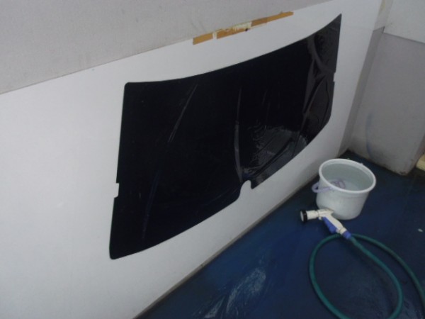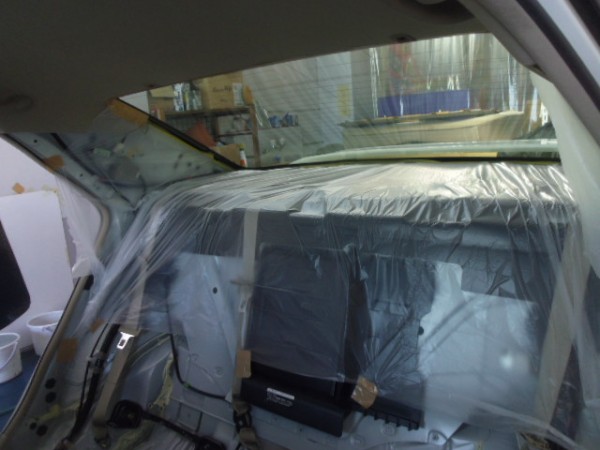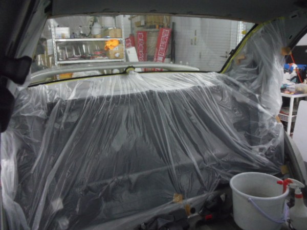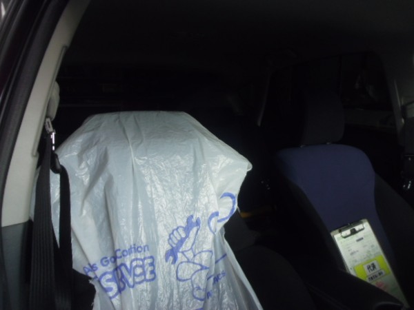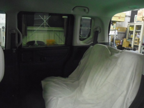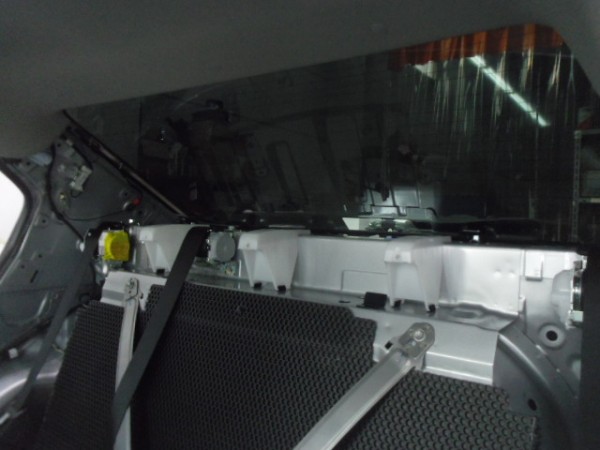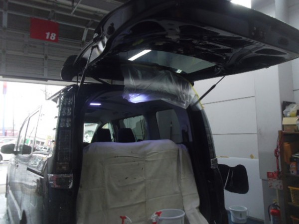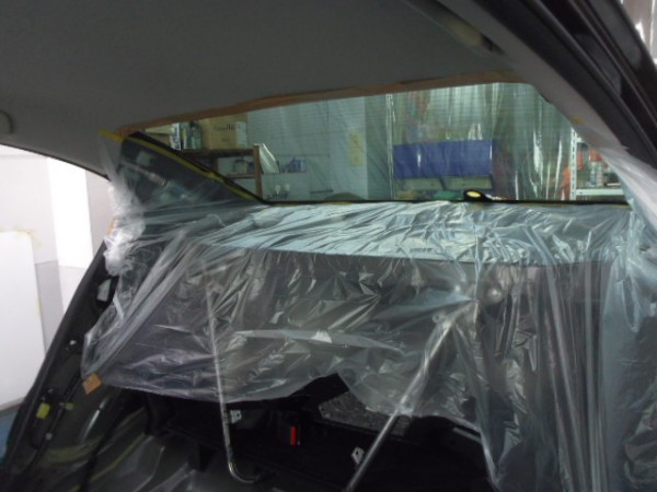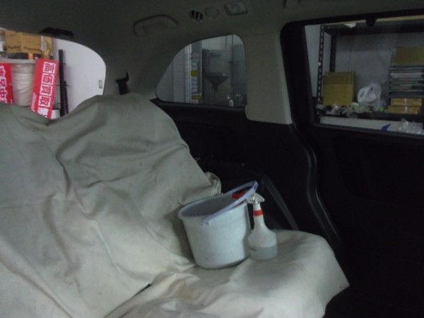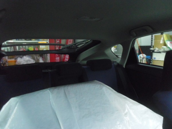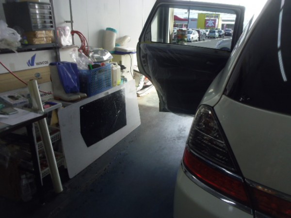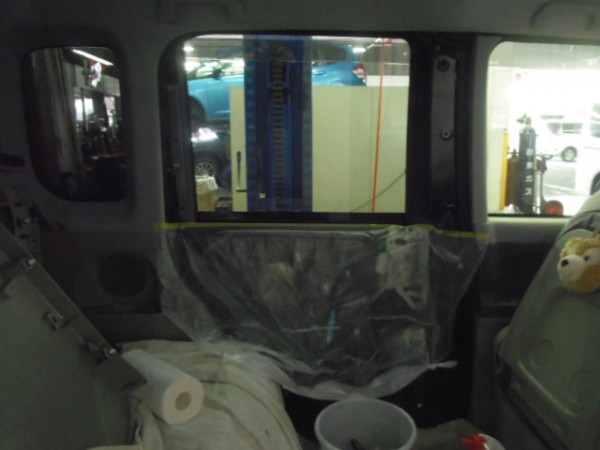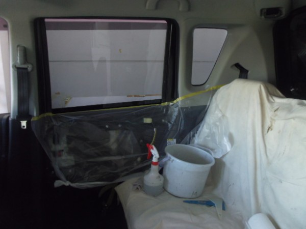 後ろにチャイルドシートが乗せてあるのでお子さんの為に断熱5%のフィルムを貼ります
