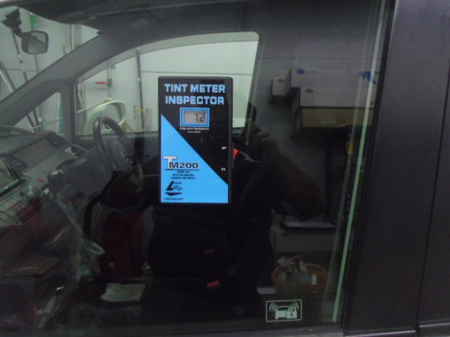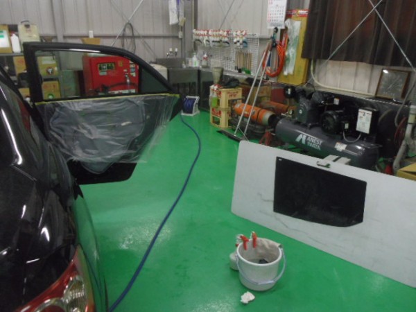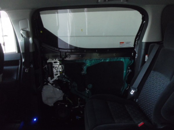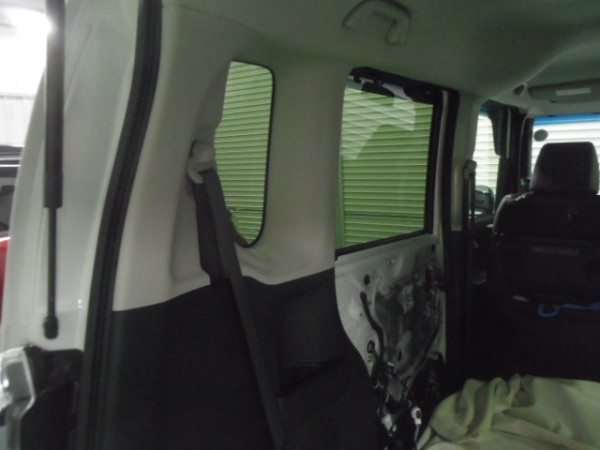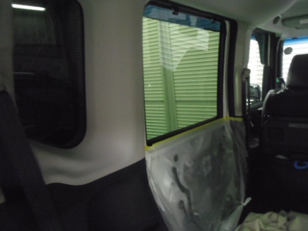 フロント3面に透明断熱、右リアスライドドア1面に断熱10%フィルムを貼ります