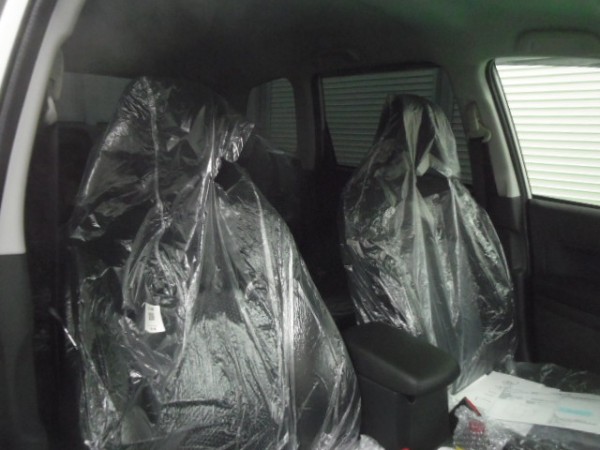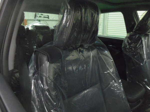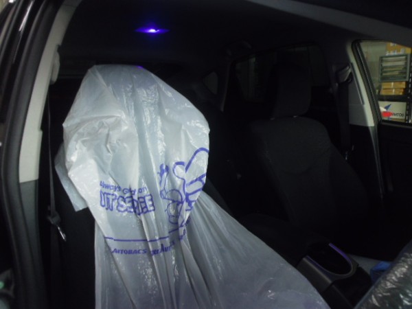 左右のヘッドレストの真ん中にあるプレートを外し、養生シーツで保護します