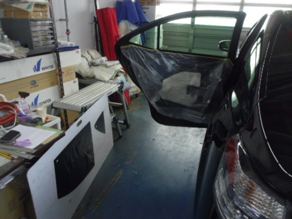 車内の荷物が見えない様に真っ黒&快適性を求め、高断熱5%のフィルムを貼って行きます