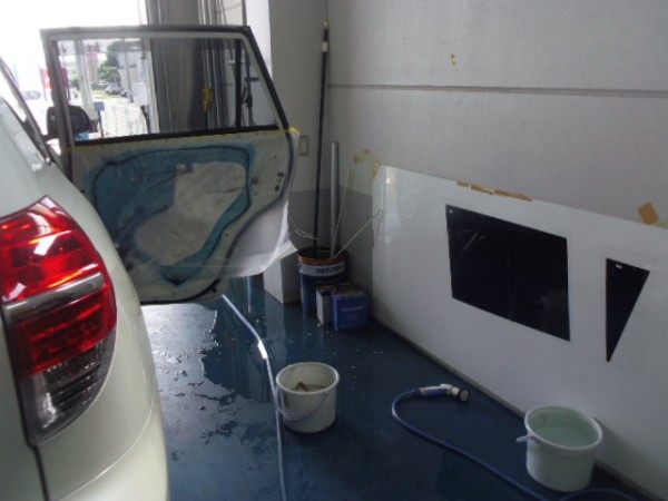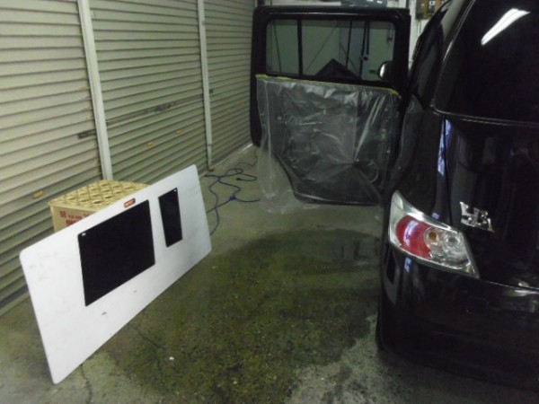 準備が出来たところでリアのスライドドアから貼っていきます