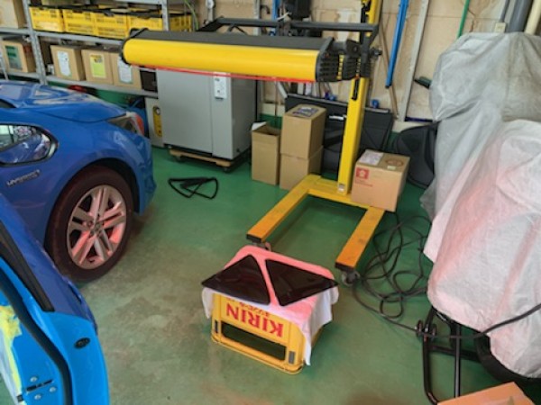 三角窓に貼ったフィルムを遠赤外線乾燥械を使って乾燥させます。